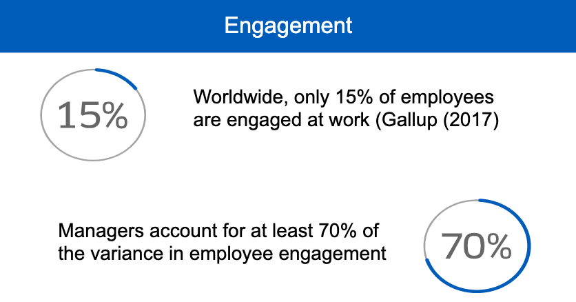15% of employees worldwide are engaged at work    ( 31% North America, but as low as 10% in Western Europe!). Workday would be in the top quartile, but there is always room for improvement – and you may not always work for a great company like this – shameless plug ;-). 70% of the variance is due to the manager. However, we all play a leadership role in some part of our job, so I think there is a lesson there for us all to learn.