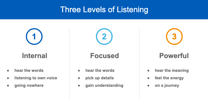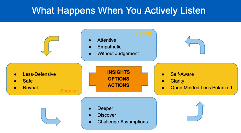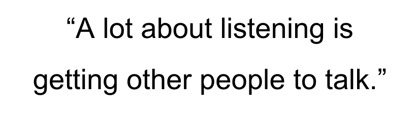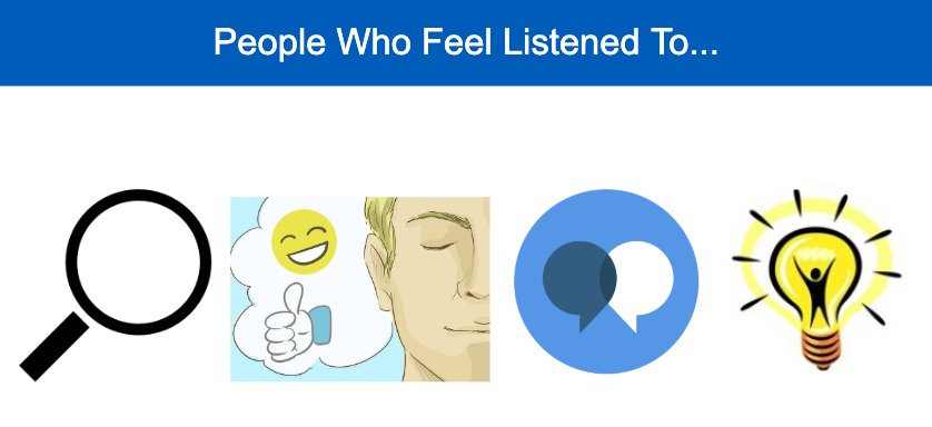 When you are really listening, the other persons tends to discover new things about themselves or new ways of looking at things, the conversation tends to leave them feeling good about themselves, and it should feel like a conversation, as opposed to an interrogation or debate, and it should be at a level where you can challenge assumptions or make suggestions.